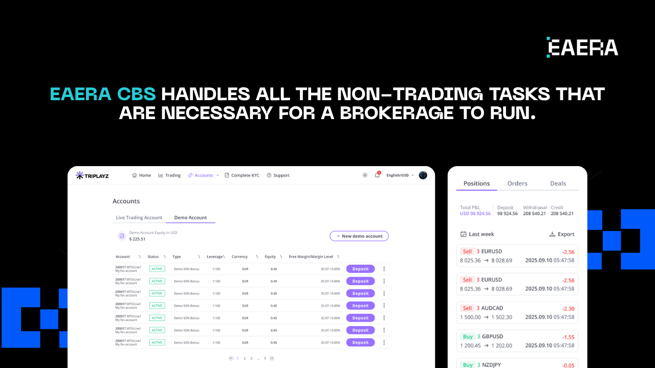EAERA’s CBS platform is the backbone of the web trade’s operations, helping with client onboarding, following workflows, managing accounts, and running funds. Triplayz compliments this with a modern interface and execution engine that is made for speed, ease to use, and real-time responsiveness.