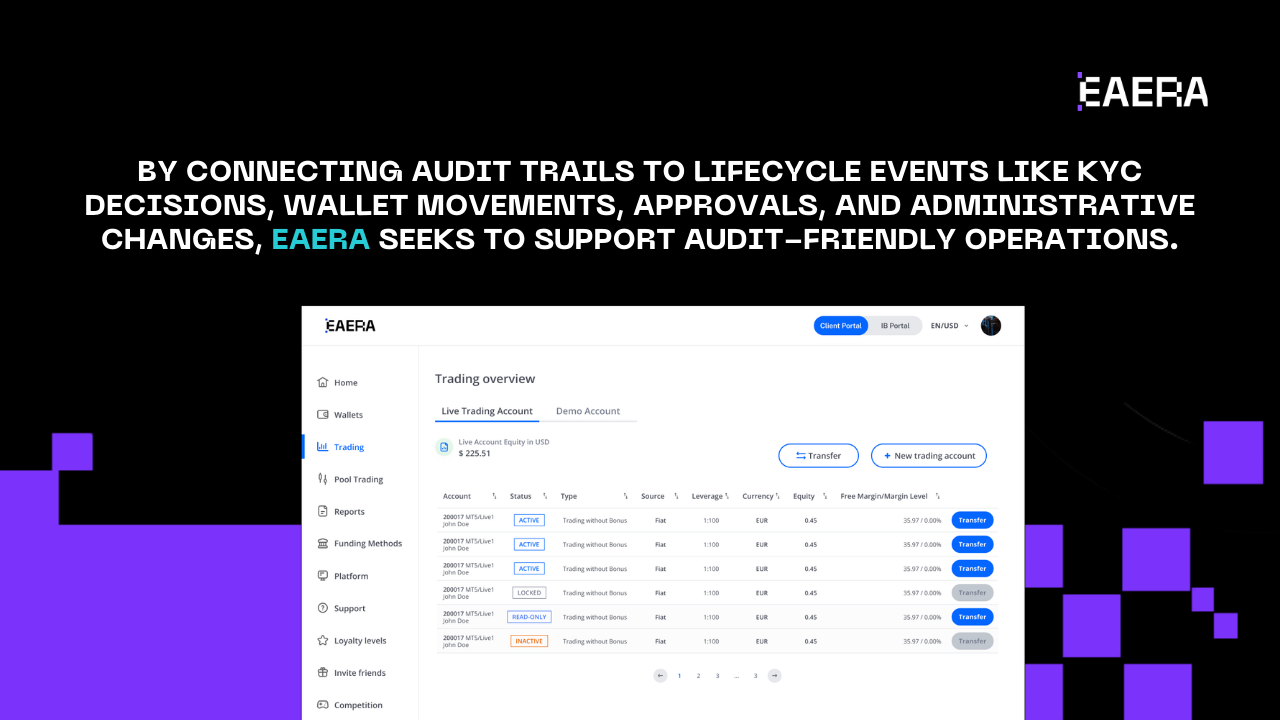 By connecting audit trails to lifecycle events like KYC decisions, wallet movements, approvals, and administrative changes, EAERA seeks to support audit-friendly operations. Transparency in data logging is important in this situation. Teams are forced to improvise when a system conceals operational history. A timeline-exposing system enables teams to demonstrate what is transpired.